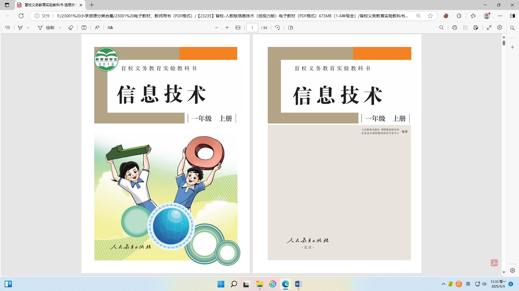 【23235】盲校-人教版信息技术(低视力版)电子教材(PDF格式)673MB(1-6年级全)